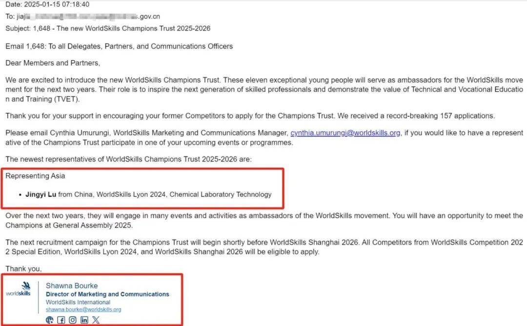 1月15日,第47届世界技能大赛化学实验室技术项目金牌选手鲁静怡收到来自世界技能组织冠军联络组的官方邮件,从全球157名申请者中脱颖而出,成功当选世界技能组织2025-2026年冠军联络小组亚洲区代表,也是我国唯一当选的世赛冠军。